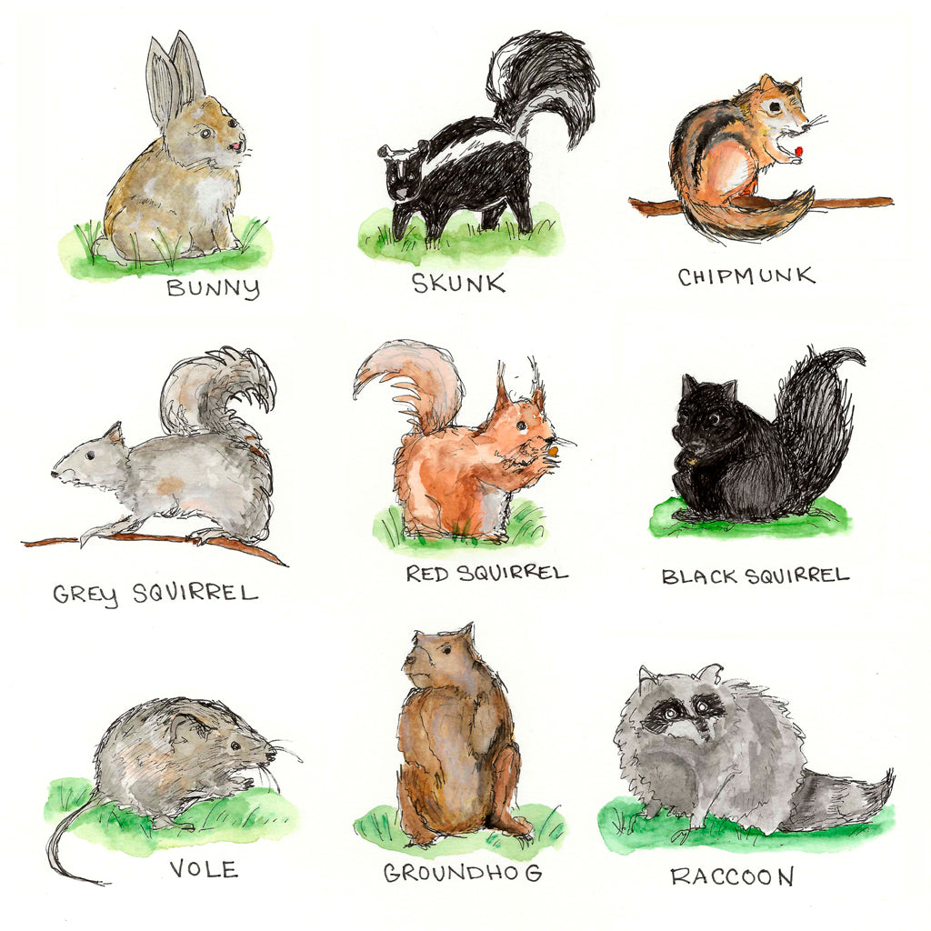 Celebrate nature with this delightful note card featuring critters oft seen in the backyard! Who's your favourite? Mine is the black squirrel.
